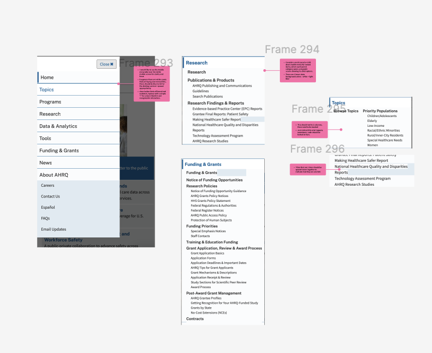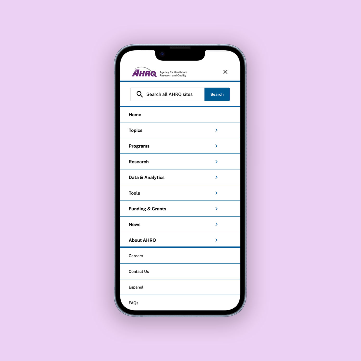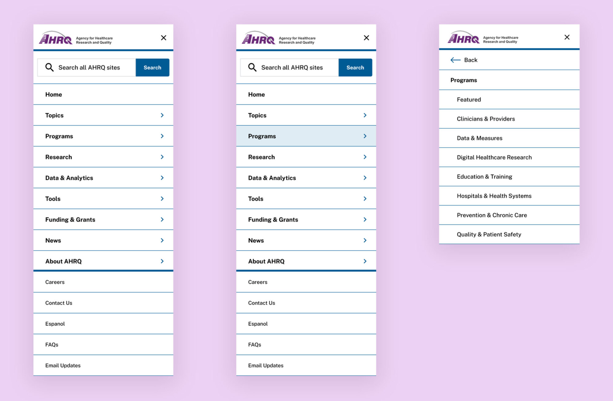 The Agency for Healthcare Research and Quality’s mobile navigation was outdated, cluttered, and full of accessibility issues. I led a redesign to create a clean, intuitive, and accessible experience that improved usability, spacing, and overall navigation clarity.